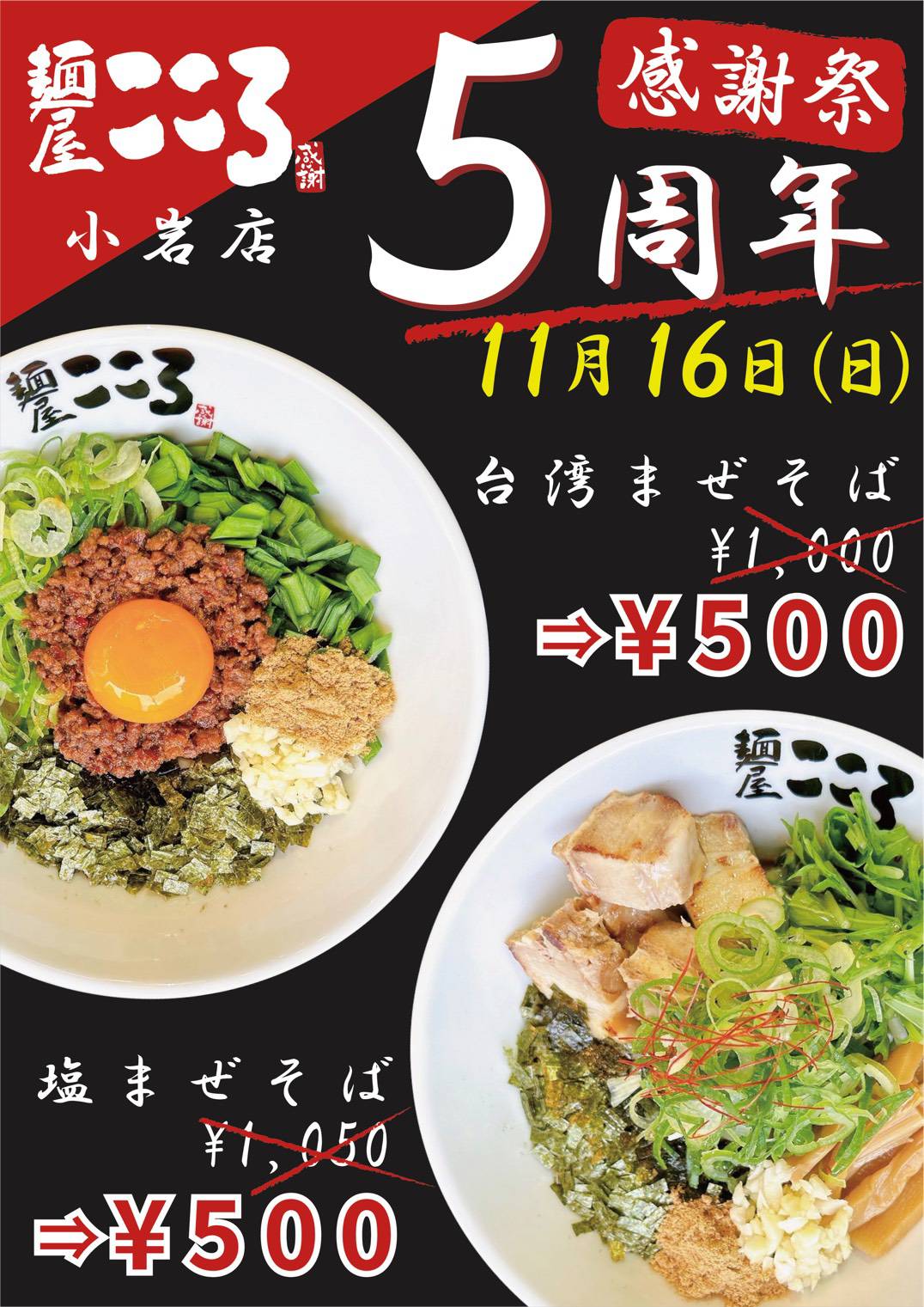 東京都江戸川区西小岩にある「麺屋こころ小岩店」が5周年を記念して、2025年11月16日(日)定番商品の「台湾まぜそば」と「塩まぜそば」をワンコイン500円で提供いたします!